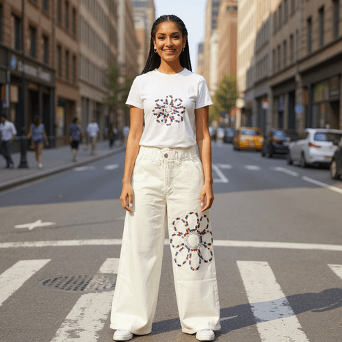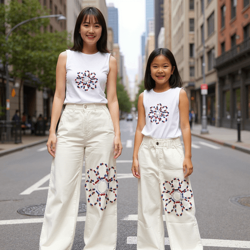 Fresh, bold, and full of joy — the Berri Blossom Set is made to bloom with every step you take together. Featuring a crisp white sleeveless tee and wide-leg denim trousers, each piece is adorned with dazzling, oversized floral motifs made of sparkling red, blue, and silver embellishments.
