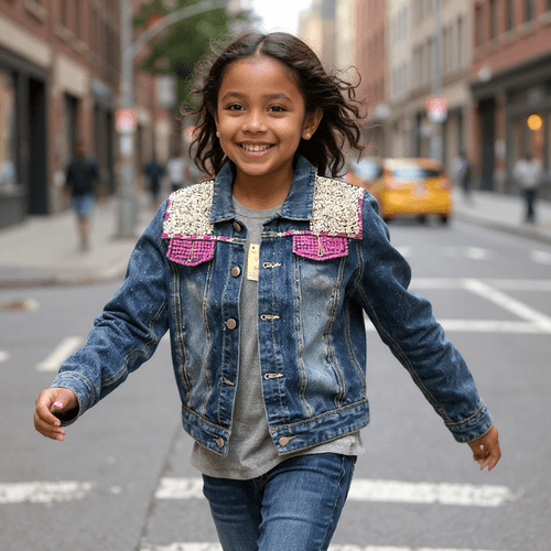 Make waves in the Berri Sparkly Mermaid Jacket — a denim dream with a splash of under-the-sea magic. Gleaming gold sequins shimmer like sunlight on water, while pops of mermaid-scale pink beads add the perfect touch of ocean-inspired glam. Whether she’s strolling the city streets or twirling seaside, this jacket turns every moment into a sparkling style adventure.