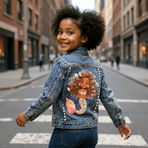 The back of the Berri Sparkly Mermaid Jacket is pure ocean enchantment — featuring a dazzling mermaid with flowing, shimmering hair and a golden-scaled tail that glitters with every step. Framed by pearl accents and a splash of sparkle, she brings the magic of the sea to city streets. It’s a whimsical, show-stopping detail that turns this denim jacket into a wearable fairytale.