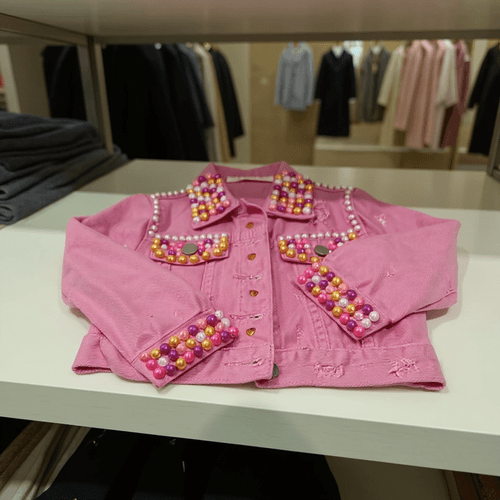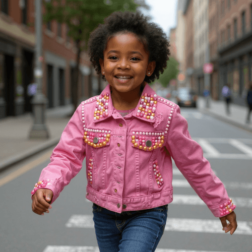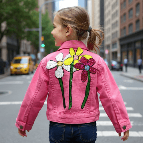 Bright, bold, and bursting with personality—the Candy Bloom Jacket is pure fashion fun! The front is decked out with clusters of glossy pink, gold, and pearl beads for a playful candy-coated sparkle, while the back blooms with oversized sequin flowers that turn every sidewalk into a springtime runway. Perfect for little style stars who love a sugar-sweet look with a pop of floral flair.
