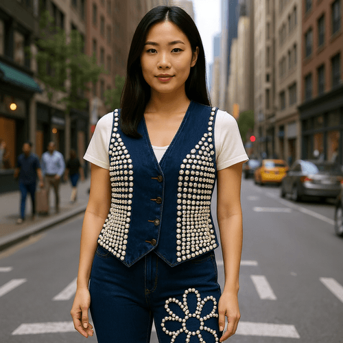 Make a bold and playful statement in this pearl-embellished denim set. The sleeveless vest features structured tailoring with rows of oversized pearls that sculpt the silhouette, while the matching high-waisted jeans bloom with a whimsical pearl daisy on the thigh. Perfect for fashion lovers who crave vintage charm with a modern twist.