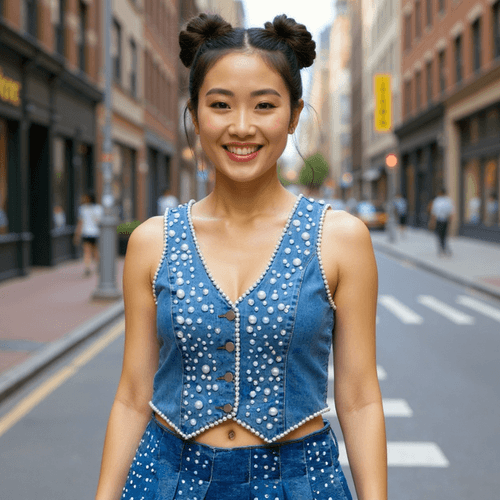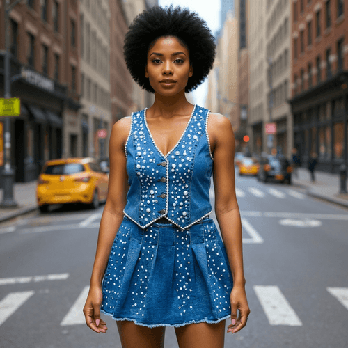 Step into bold elegance with the Pearl Radiance Denim Set, a statement-making two-piece designed to shine in every season. This look pairs a tailored, pearl-embellished vest with a playful A-line mini skirt, both crafted in rich denim and adorned with luminous pearls that shimmer with every movement.