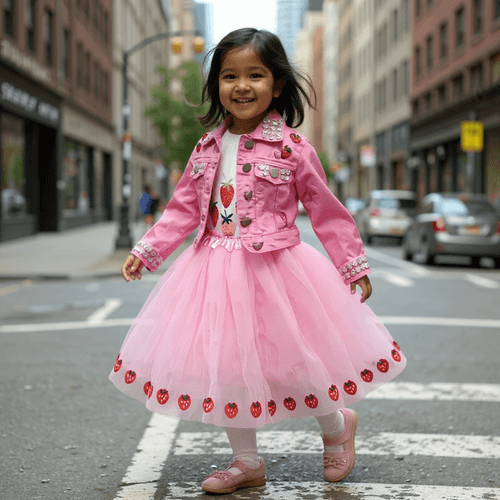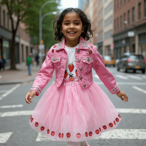 Sweet from head to toe, the So Berri Bundle is a triple treat for little style stars! Featuring our pink rhinestone-and-pearl embellished So Berri Jacket, a sparkle-studded strawberry tee, and a twirl-worthy tutu dotted with juicy strawberry appliqués, this set is pure sidewalk-runway magic. Perfect for birthdays, photo shoots, or just turning an ordinary day into a berry fabulous one.