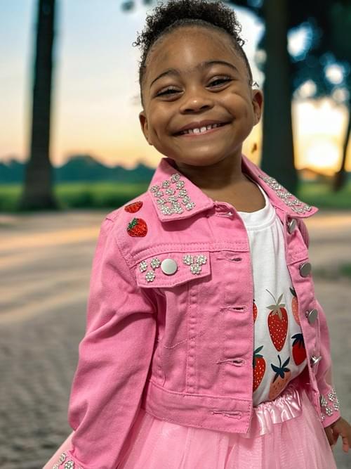 Berry sweet and bursting with charm, the So Berri Jacket is pure joy in pink! This cropped denim beauty is sprinkled with sparkling rhinestones, pearl accents, and playful strawberry patches—perfect for little fashionistas who love to shine. Whether paired with a tutu or jeans, it’s a juicy statement piece that turns every sidewalk into a runway.